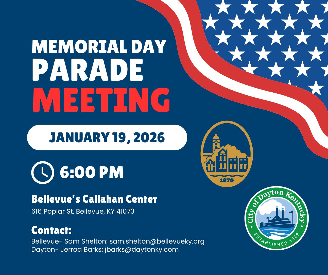 The kickoff meeting for the 2026 Bellevue-Dayton Memorial Day Parade Committee will be taking place Monday, January 19 at 6pm in the Callahan Community Center. Please email Sam at sam.shelton@bellevueky.org if you are interested in joining the committee!