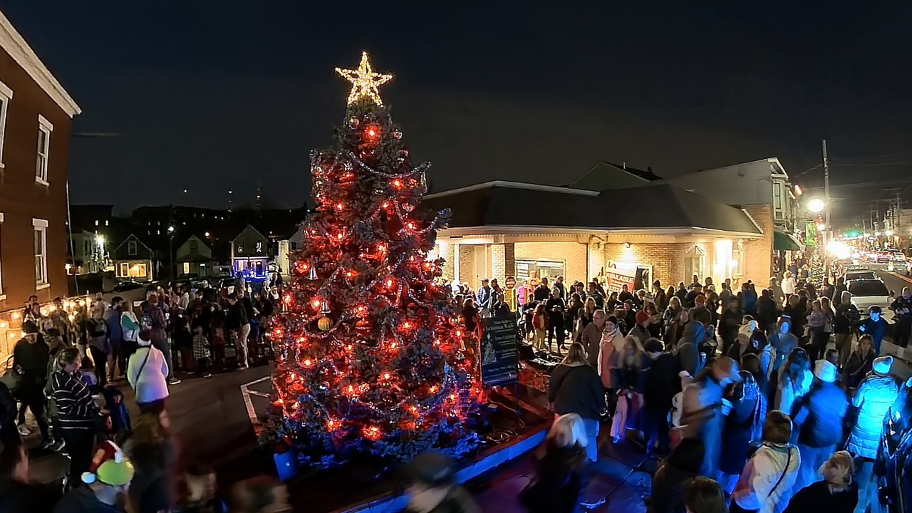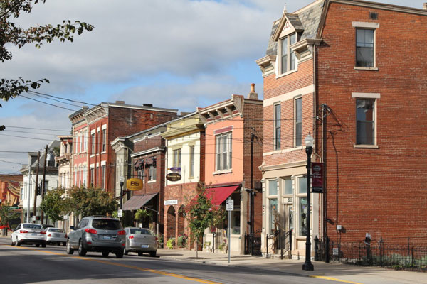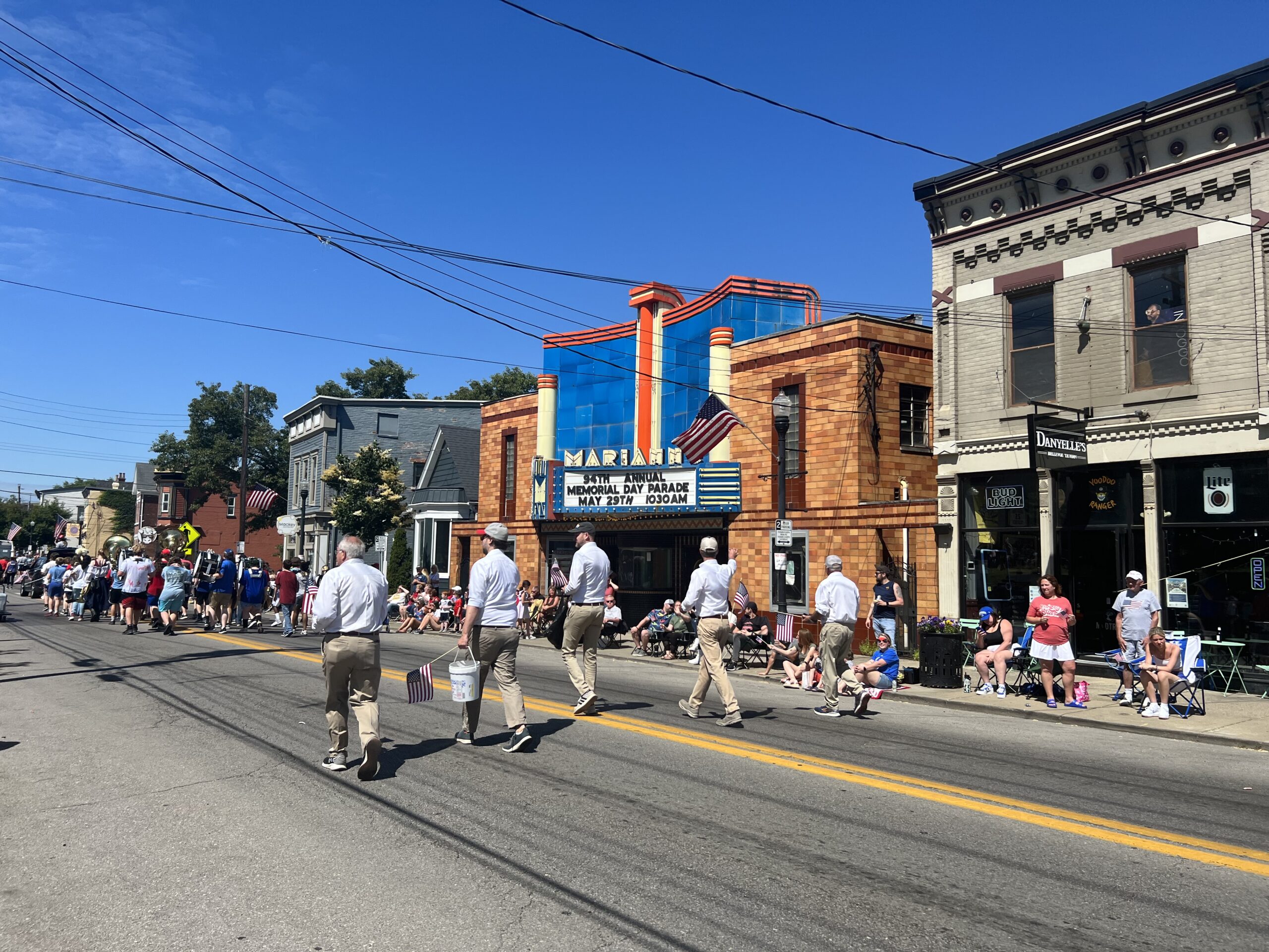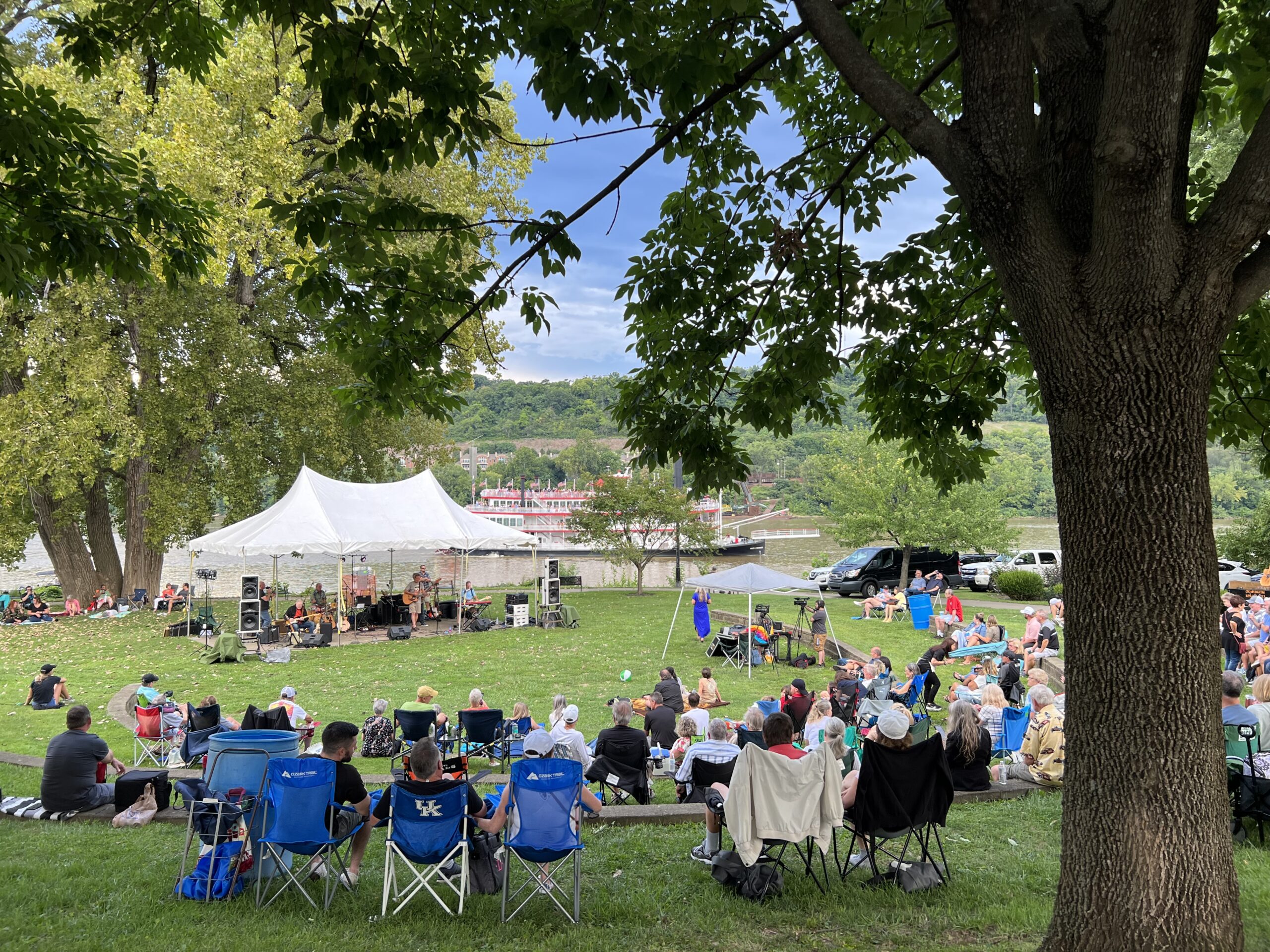 Concert at a public park in Bellevue, Kentucky as a riverboat cruises by on the Ohio River