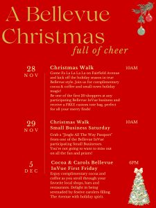 The Bellevue Business Association invites you to come and shop the Avenue for your gift giving occasion! Check out the list below of the fun activities that are happening on the avenue and remember to shop local this holiday season! Make sure you pick up your Jingle All the Way Passport beginning November 28 at any participating Bellevue InVue business (they’ll be posted by Wednesday, November 26). Once you’ve got it, begin your journey and visit each business listed to collect every stamp—because yes, the Elves of Accountability are definitely watching. When you’ve completed the route, deliver your finished passport to Frame & Hang Studio Gallery by December 22, 2025. Then sit tight and wait—Santa’s drawings will take place on December 23, and winners will be announced!