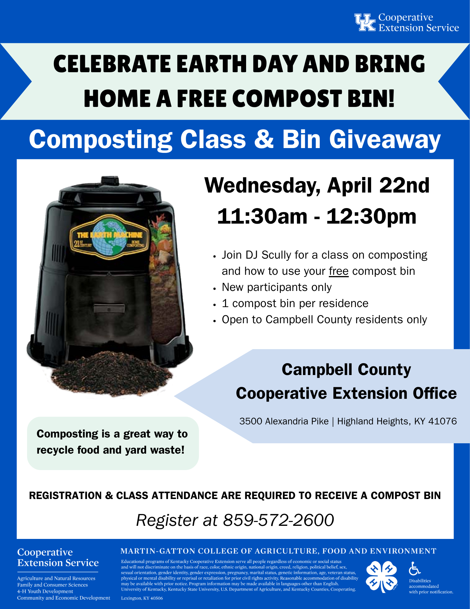 Join us Wednesday, April 22, 11:30am – 12:30pm at the Campbell County Cooperative Extension Office for a special session with DJ Scully! Learn how to compost and make the most of your free compost bin.