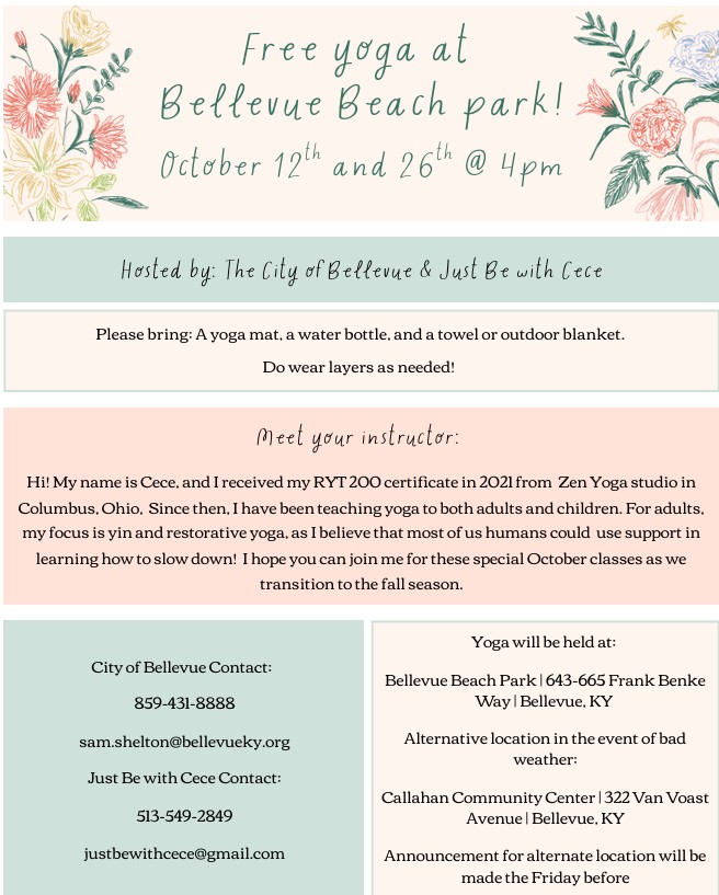 Just Be with Cece invites you to a free yoga class at the Bellevue Beach Park on October 12 and 26th at 4pm. Please bring a yoga mat, water bottle, and a towel or outdoor blanket. DO wear layers as needed. Questions? Contact Cece at 513-549-2849 or justbewithcece@gmail.com.